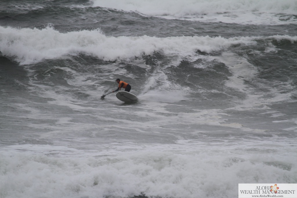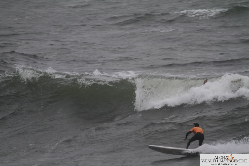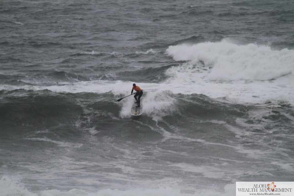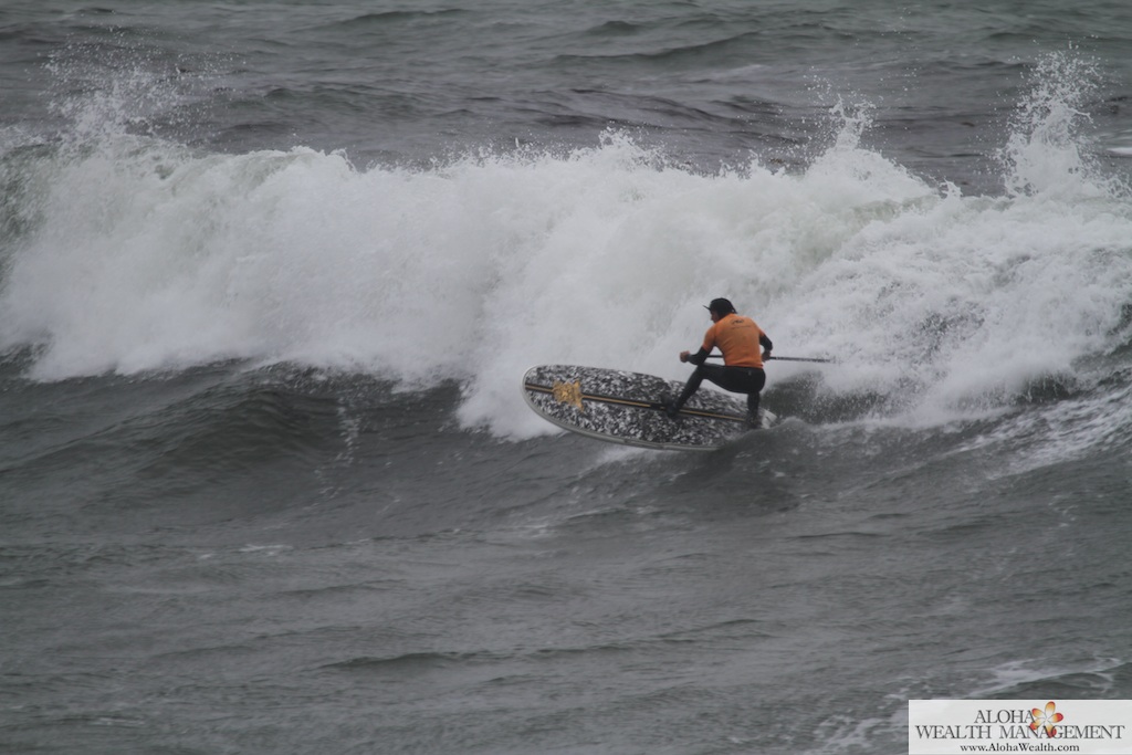 The Coast Guard upon getting the latest NOAA weather reports, pulled the plug on Sundays Events and upon hearing this I knew that it would be now or never to get a great result in the surf. I had seen Zane and Matt surf earlier and knew they were the ones to beat. Since I really had my sights set on the overall prize and knew it would come down to my result in the surf so I immediately started working on a game plan. The plan was simple be patient catch the biggest waves of the day and get back out to the lineup faster than anyone else so I could assure I got 3 great waves. The waves were big bumpy and dredging with low tide and lots of exposed kelp, but still some great faces were going unsurfed and lots of the paddlers were having a hard time just standing up let alone paddling all the way out for their heats.