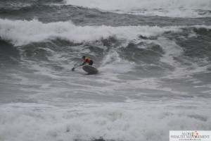 5:00 pm finally came around and the heat started. Sean Poynter and I got into position on the outside and tried to hold our ground amidst the 30+mph wind gusts. You had to be careful not to get blown in too deep where the wave would jack up too steep, and clean you up with overhead walls of whitewater. After only 2 minutes of waiting a good one popped up I was in position and took the drop. It was late and I was paddling hard but the lip of broke with me in it and accelerated me down the wave. I was hanging on using my Werner Nitro to brace and the bumps were throwing me all around. After regaining control and sighting down the line I could see the wave doubling up. I drove the edge of the board high and fast along the wave to make the next section and got right into the pocket of the wave making a few little turns around patches of kelp. I knew the wave would section again from some of my previous experiences surfing “Middle Peak” and I set my sights on making the section and staying upright. I knew the Pocket Rocket would hold the line and provide the speed if I could just stay upright. The wave suddenly sat down and I had to paddle hard and drive left for to make the next section, but I found myself dropping hard and straight into a dredging pit. I stomped on the kick pad with my back foot and engaged the quad fins to drop and set my bottom turn, which accelerated me out onto the green face. A little cutback and bam the whitewash hit me and I accelerated out in front of it again and safely over the shoulder.